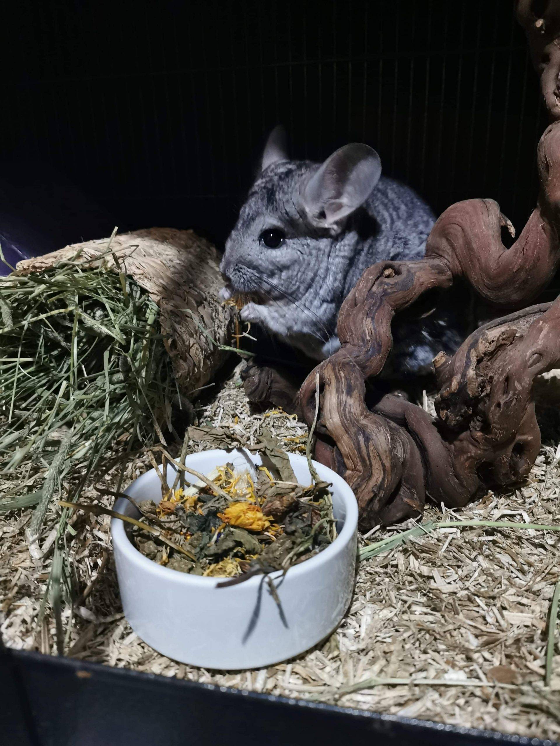 Alongside hay, we feed a daily handful of dried or fresh forage (leaves, herbs, flowers, roots, bark, branches). Chinchilla Scientia has some great advice on feeding a ‘natural’ diet and research on the diet of wild chinchillas, including lists of safe leaves, herbs, branches etc.