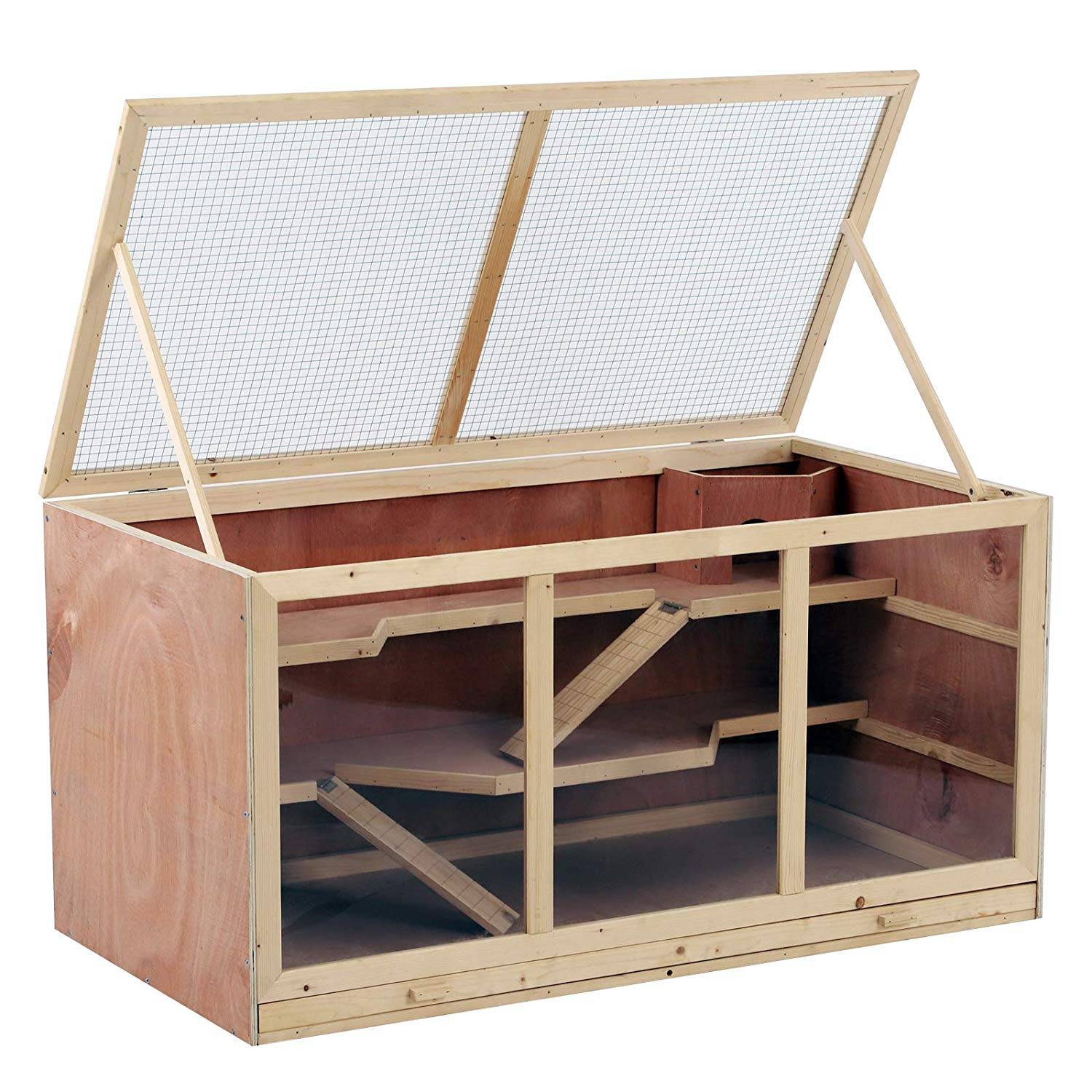 We also strongly advise providing a multi-chambered house in the cage for your hamster. These replicate the multi-chambered burrow your hamster would inhabit in the wild, with different sections for nesting and stashing food. These can be purchased from Amazon, Rodipet, Getzoo and Etsy.
