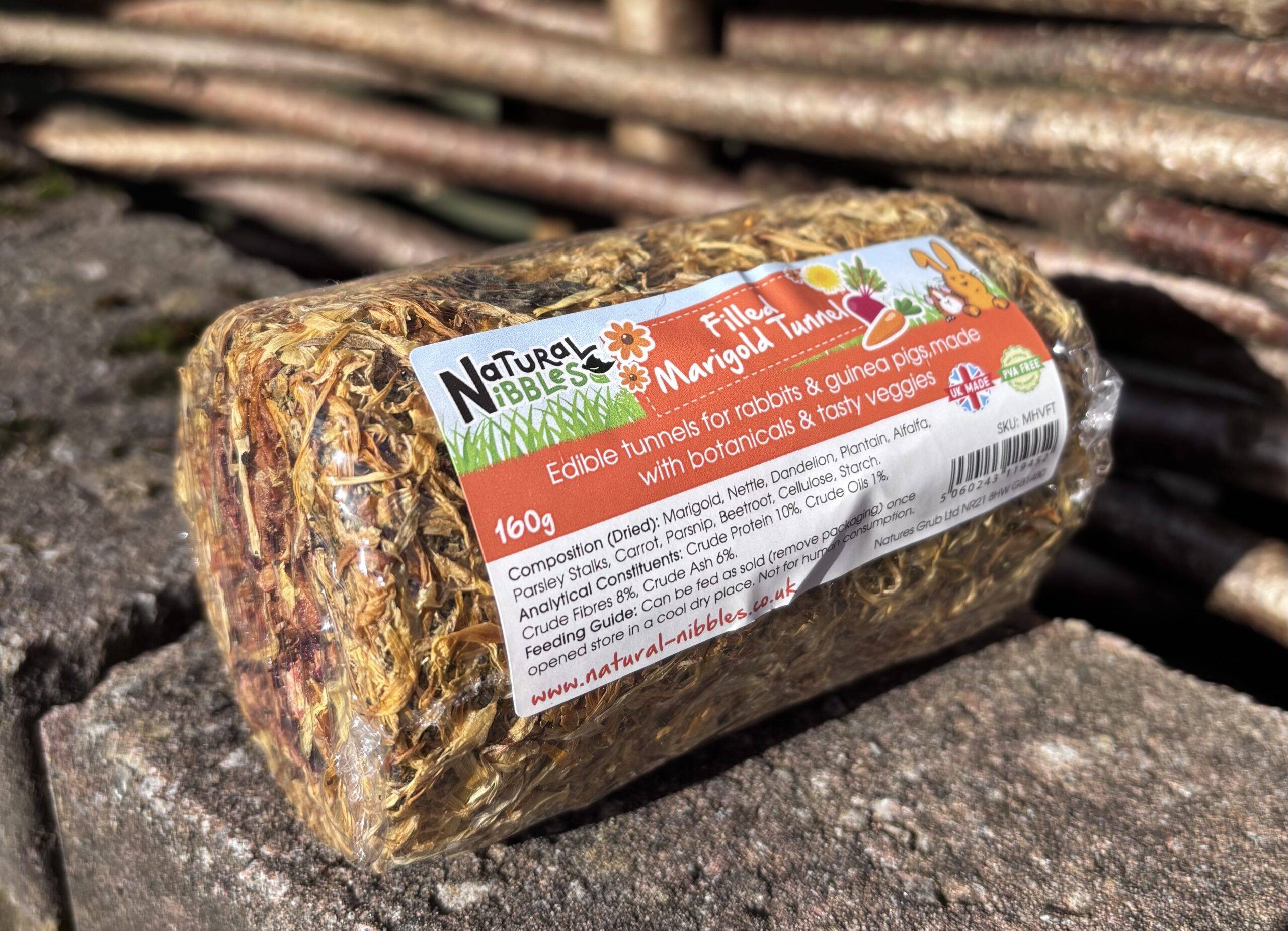 Natural Nibbles 100% edible tunnels are coated in natural marigold petals, then filled with dried mixed veggies and nettle leaf. These tunnels have an inner diameter of 4.5cm-5cm which makes them ideal for small rodents, smaller hamsters, and guinea pigs. They also work great as a filled chew toy for rabbits.