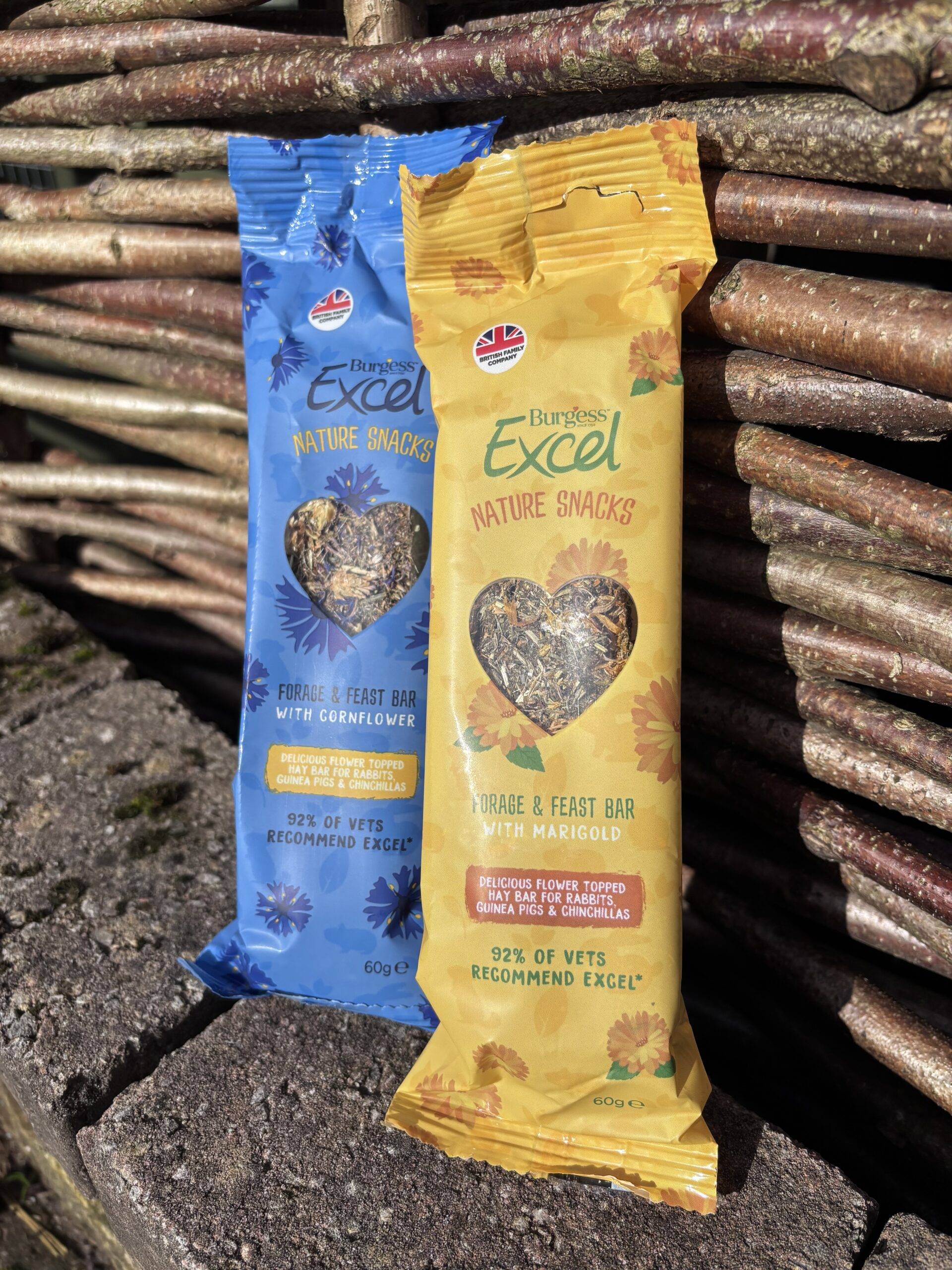 Excel Forage & Feast hay bars topped with cornflower or marigold. Perfect for rabbits, guinea pigs, chinchillas and degus.