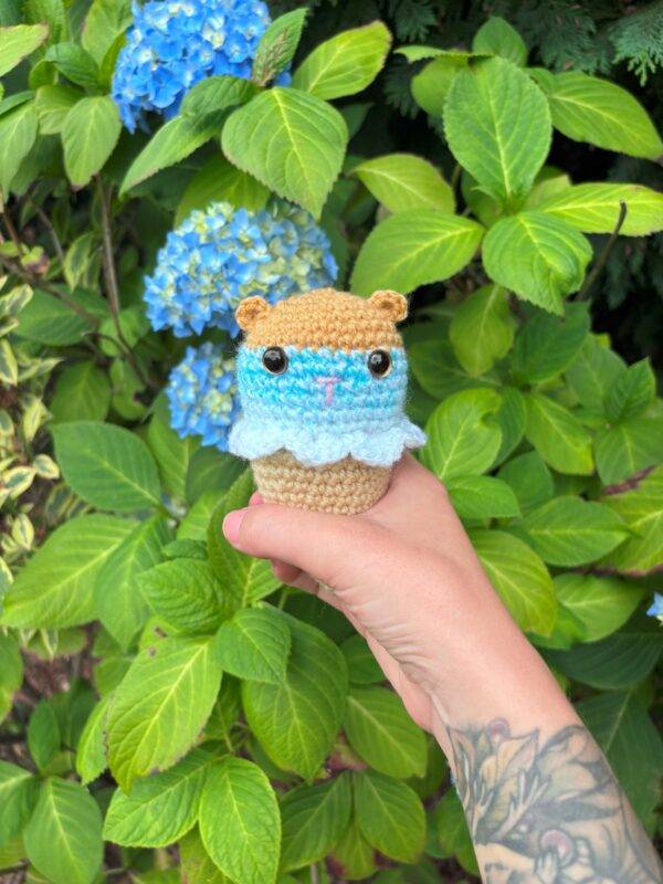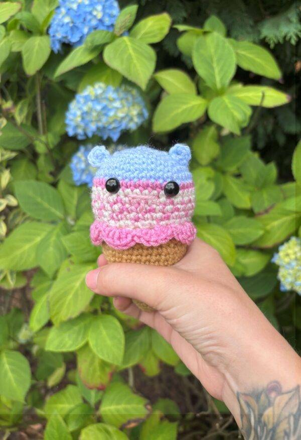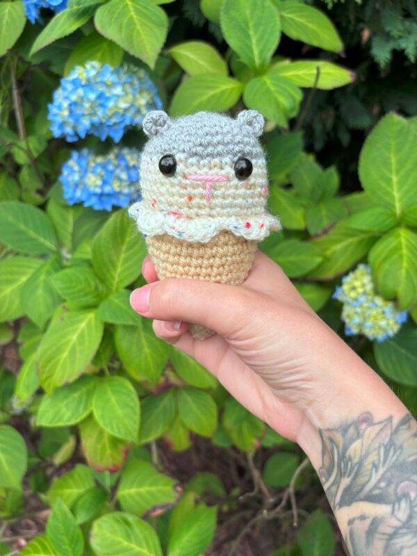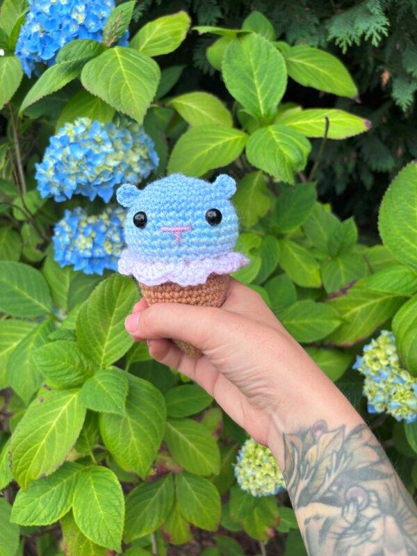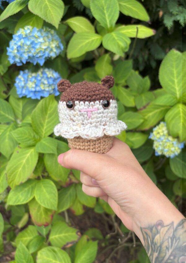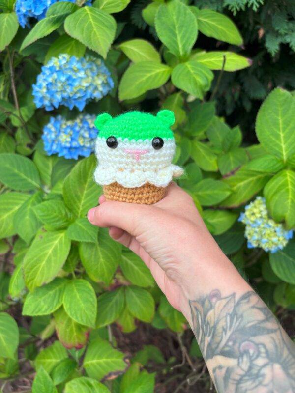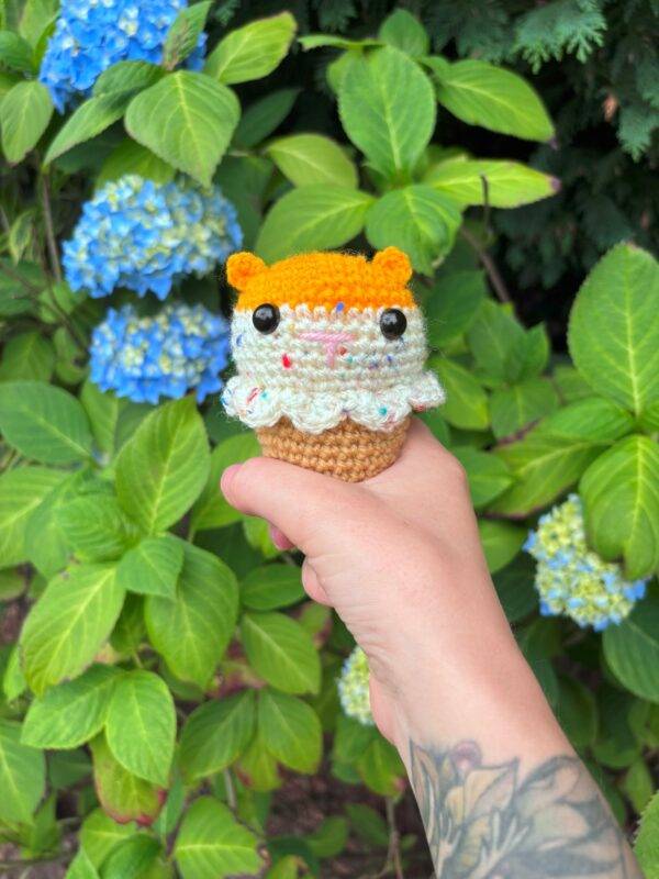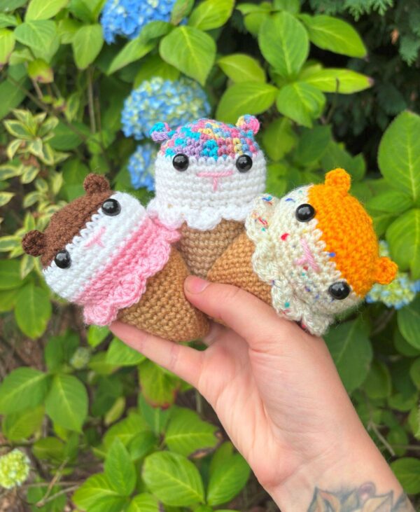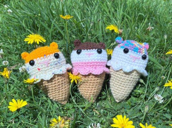 Each cone features a colourful crocheted hamster snugly nestled in an ice cream cone, creating a fun and whimsical decorative item that brings joy to any shelf, desk, or display. Available in a variety of colour combinations, no two cones are quite the same!