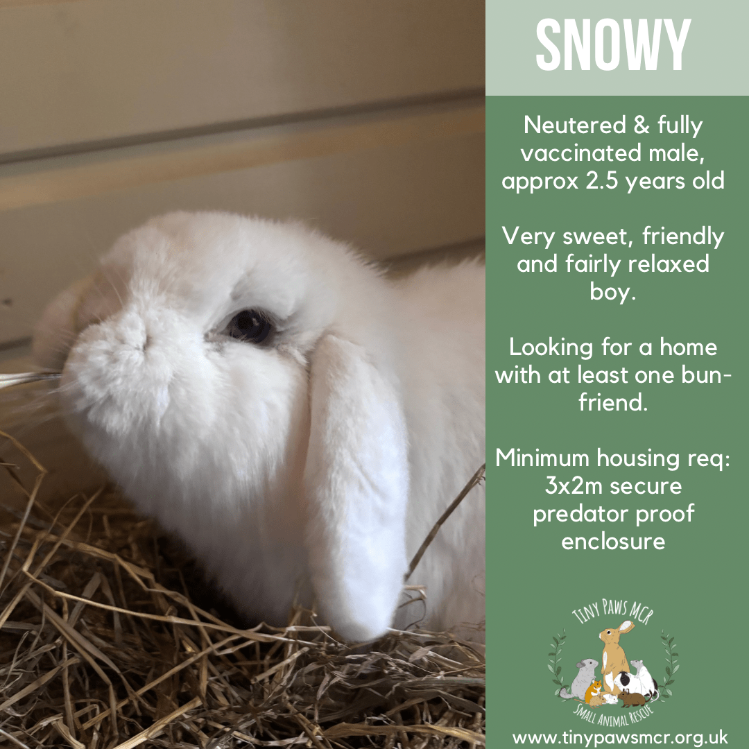 Minimum housing requirements: Permanent 24/7 access to an enclosure at least 3x2m. This must be bunny-proofed and predator proof. Snowy can live outdoors or indoors.