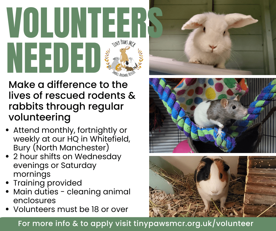 We are looking for additional dedicated regular volunteers to assist with cleaning of enclosures and other animal care tasks at our HQ in Bury, North Manchester (BL9). At present, most volunteer work will focus on our rabbit and guinea pig residents.